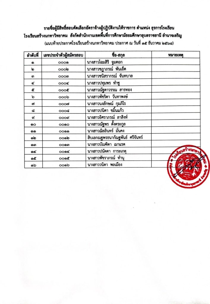 โรงเรียนสร้างนกทาวิทยาคม ขอประกาศรายชื่อผู้มีสิทธิ์สอบคัดเลือกอัตราจ้างผู้ปฏิบัติงานให้ราชการ ตำแหน่ง ธุรการโรงเรียน และขอให้ผู้ที่มีรายชื่อตามประกาศ เข้ารับการสอบประเมินสมรรถนะความรู้ความสามารถทั่วไป ความรู้ความสามารถเฉพาะตำแหน่ง และการสอบสัมภาษณ์ในวันอังคารที่ 16 ธันวาคม พ.ศ. 2568